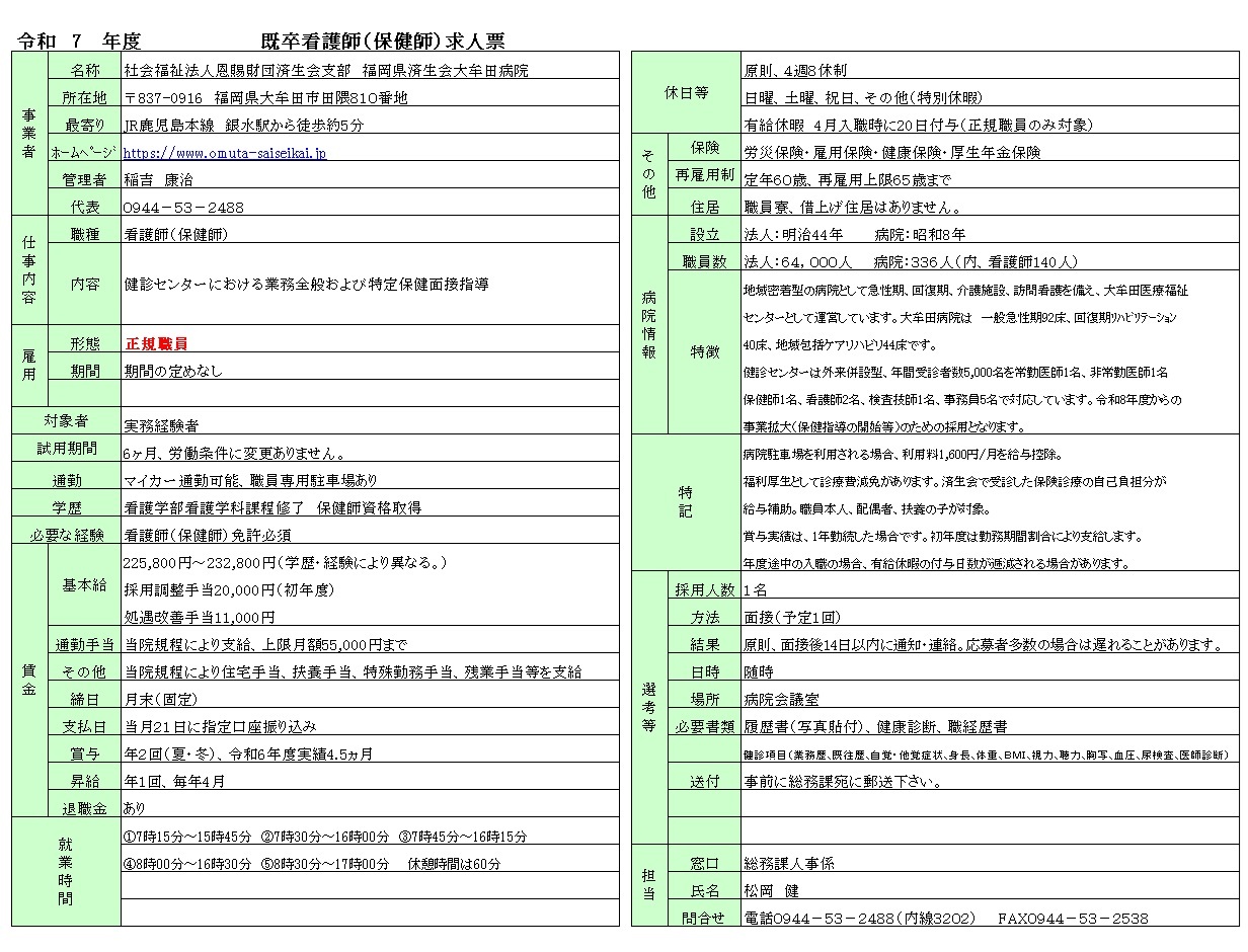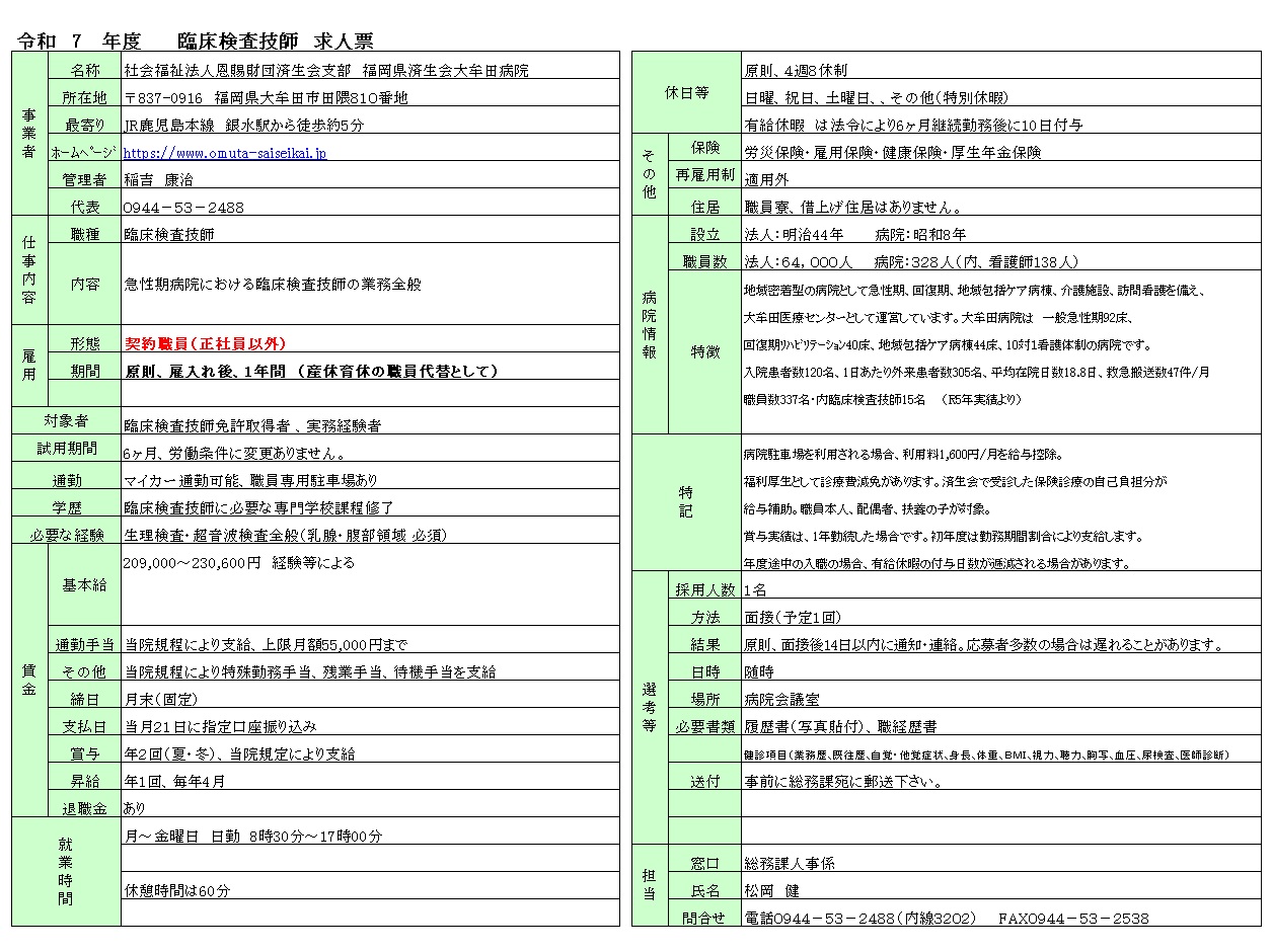 | 問い合わせ先 | 〒837-0916 福岡県大牟田市田隈810 済生会大牟田病院 松岡 TEL 0944-53-2488 FAX 0944-53-2538 |