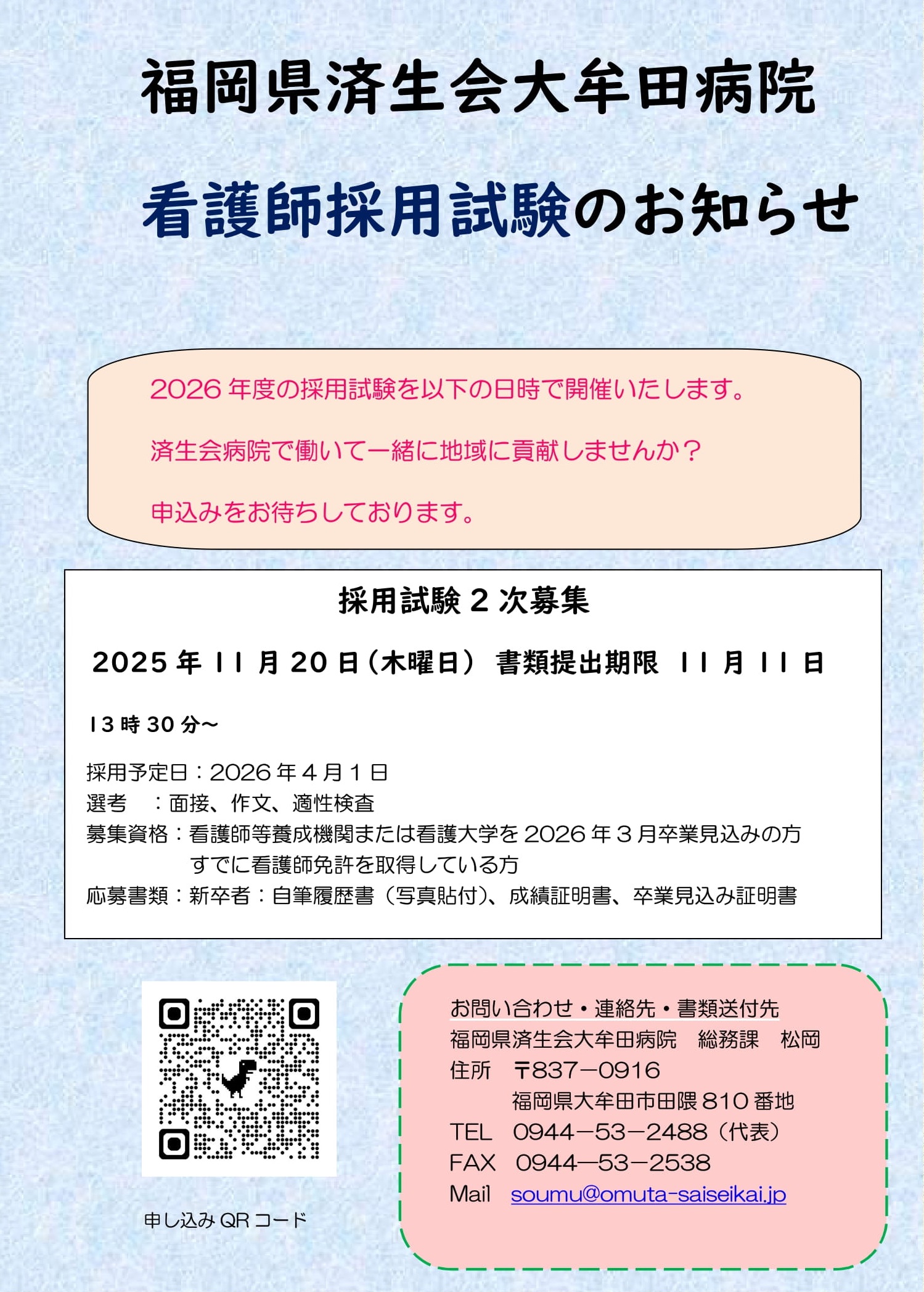2026年度看護師 新規学卒者募集(2次募集)案内